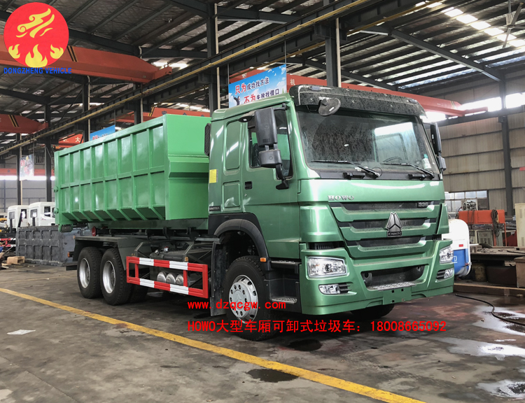 重汽豪沃后雙橋大型勾臂式垃圾車已下線,準(zhǔn)備發(fā)往港口。