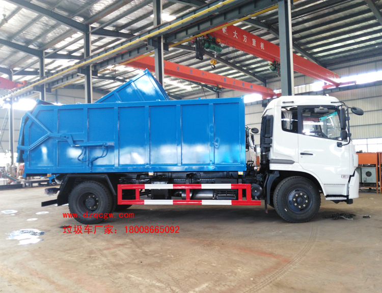 卸料結構:系用箱卸料,由兩只液壓油缸直接舉升車廂進行卸料,箱底與地面夾角不小于45度,以實現垃圾依靠自重能自行卸下的專用自卸運輸車。