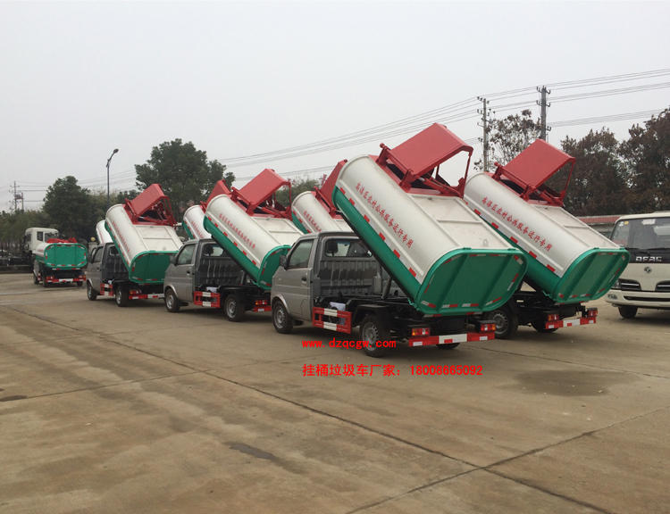 我公司掛桶垃圾車組成部分:上裝部分由密封式垃圾廂、液壓系統、操作系統組成。舉升油制缸(2支)垃圾廂可自吊上放下,上下一次工作循環時間≤50S。該掛桶式垃圾車的特點是一個車能配幾十個垃圾廂,能實現一臺車與多個垃圾廂聯合作業,循環運輸,充分提高了車輛的運輸能力,特別適用于短途運輸,如環衛部門對城鎮垃圾的清 理、運輸等。