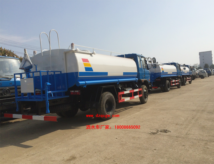 底盤說明:153豪華駕駛室,軸距4500mm或4700mm,4950mm,康機或玉柴國四發動機,大同6檔變速箱,5t前橋/10t后橋,10.00尼龍胎,車架250雙層。罐體有效容積:9.97立方米。帶免征。 專用功能:該多功能灑水車適合于各種路面的灑水、噴霧、降溫、除塵、沖洗塵埃臟物,亦可用于園林綠化、市政環衛、路面養護及應急消防、運輸飲用水等。專用部分由罐體、水泵、球閥、輸水管道、灑水裝置等部件組成。水泵、取力箱、球閥均為國家定型產品,具有性能良好,工作可靠、壓力高、流量大、油耗低等特點。 改裝部分:標配前沖、后灑、側噴、工作平臺、綠化高炮、自流閥、消防接口,輸水管3米2根,8噸以上罐體帶高位花灑2個,億豐泵或金龍泵,控制方式為手動。選裝氣動閥門控制;高位花灑,大鴨嘴,藥盤,罐體側面加裝萬向可調節噴頭,罐體后部壓塵噴灑裝置,兩個圓警燈或長警燈,LED箭頭燈,泵可選裝威龍泵或農藥噴霧裝置。 |